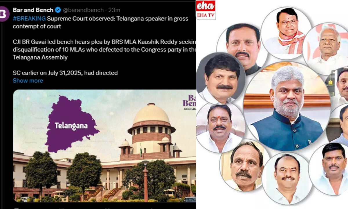 తెలంగాణ స్పీకర్పై సుప్రీంకోర్టు తీవ్ర వ్యాఖ్యలు చేసింది. తెలంగాణ స్పీకర్ కోర్టు ధిక్కారానికి పాల్పడ్డారని.. పార్టీ ఫిరాయించిన 10 మంది ఎమ్మెల్యేలను అనర్హులుగా ప్రకటించాలని BRS ఎమ్మెల్యే కౌశిక్ రెడ్డి దాఖలు చేసిన పిటిషన్పై విచారణ జరిగింది. CJI BR గవాయ్ నేతృత్వంలోని ధర్మాసనం విచారణ చేపట్టింది. వచ్చే వారంలోపు నిర్ణయం తీసుకుంటారా లేదా కోర్టు ధిక్కారాన్ని ఎదుర్కొంటారా అని వ్యాఖ్యానించింది. స్పీకర్కు రాజ్యాంగపరమైన ఇమ్యూనిటీ లేదని మేము ఇప్పటికే నిర్ధారించామన్నారు. ఆయన తన నూతన సంవత్సరం వేడుకులను ఎక్కడ గడపాలనుకుంటున్నారో నిర్ణయించుకోవడం ఆయన ఇష్టమని సుప్రీంకోర్టు వ్యాఖ్యానించింది.