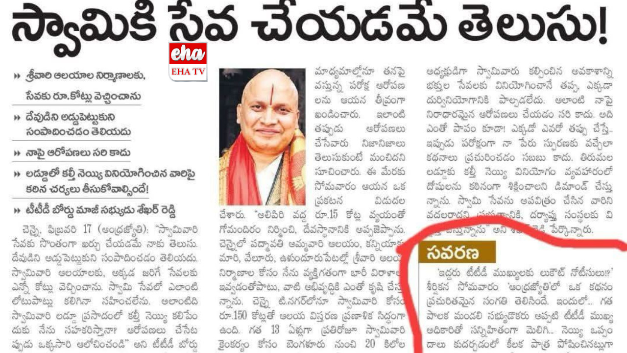 ఇద్దరు టీటీడీ ముఖ్యలుకు లుకౌట్ నోటీసులు అంటూ ప్రముఖ పత్రిక ఆంధ్రజ్యోతిలో ఓ శీర్షిక వచ్చింది. ఈ శీర్షిక సమాచారం లోపం వల్ల జరిగిందంటూ ఆంధ్రజ్యోతి పత్రిక సవరణ ఇచ్చింది. ఈ సవరణలో ‘ఇద్దరు టీటీడీ ముఖ్యులకు లుకౌట్ నోటీసులు!?’ శీర్షికన సోమవారం ‘ఆంధ్రజ్యోతి’లో ఒక కథనం ప్రచురితమైన సంగతి తెలిసిందే. ఇందులో... గత పాలక మండలి సభ్యుడొకరు అప్పటి టీటీడీ ముఖ్య అధికారితో సన్నిహితంగా మెలిగి... నెయ్యి ఒప్పందాలు కుదర్చడంలో కీలక పాత్ర పోషించినట్లుగా ప్రచురితమైంది. ఇద్దరికీ లుకౌట్ నోటీసులు జారీ కానున్నట్లు సమాచారం అందినట్లు కూడా ప్రచురితమైంది. అయితే, ఇది నిజం కాదు. సమాచార లోపం కారణంగా ఈ పొరపాటు జరిగింది' అని ఆంధ్రజ్యోతి రాసుకొచ్చింది.