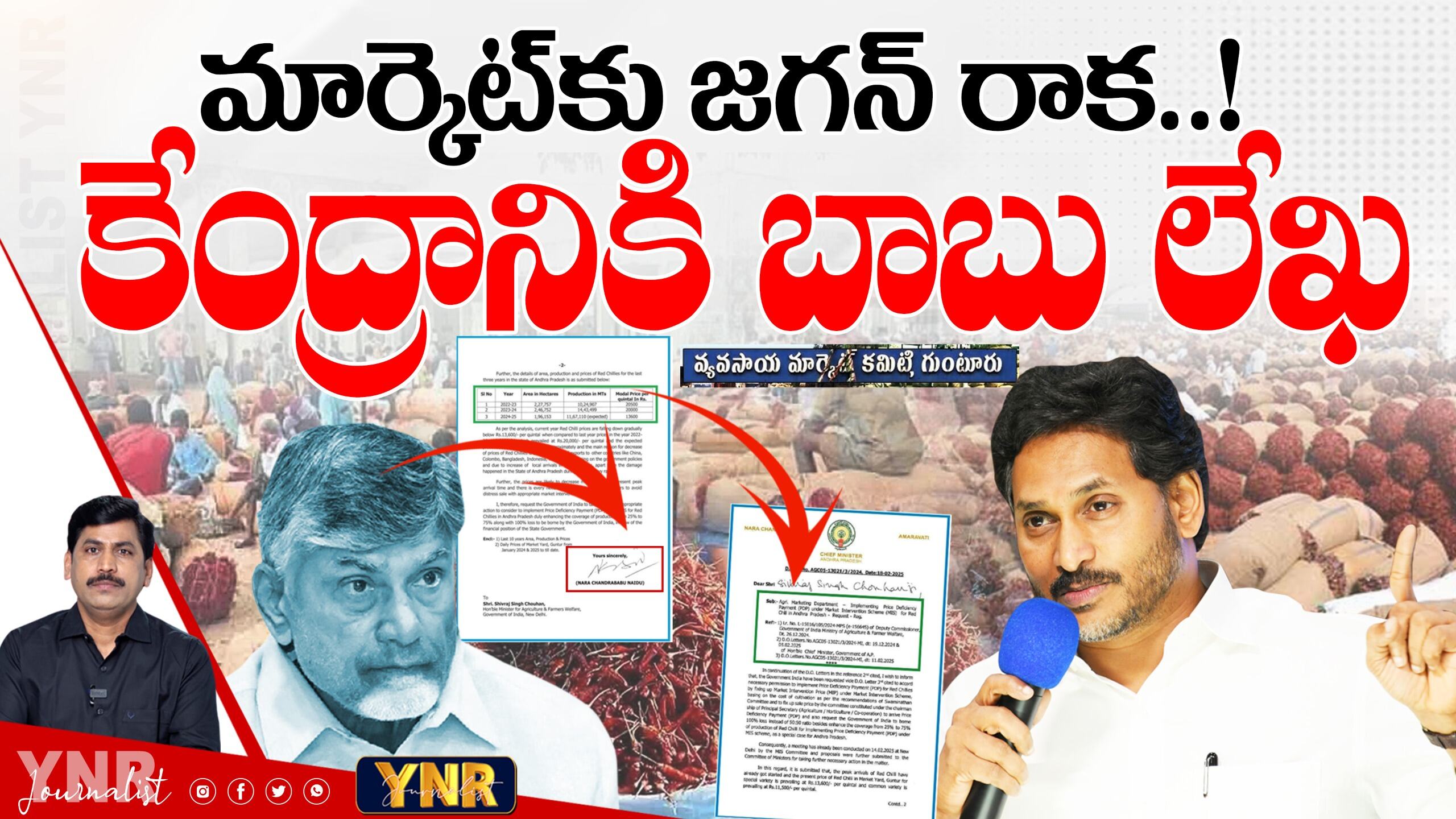 తెలుగు రాష్ట్రాల్లో మిర్చి దారుణంగా పడిపోయింది. గత నాలుగైదుళ్లుగా ఈ స్థాయిలో పడిపోవడం ఇదే తొలిసారి. పెరిగిన ధరల కారణంగా ఎకరానికి మిర్చి పెడితే దాదాపు లక్షన్నర పెట్టుబడి అవుతుంది. దీంతో క్వింటాల్ మిర్చి రూ.20 వేలు ఉంటేనే రైతుకు కాస్తో కూస్తో గిట్టుబాటు అవుతుంది. కానీ రేటు దారుణంగా పడిపోవడంతో తెలుగు రాష్ట్రాల్లో రైతులు ఆవేదనతో ఉన్నారు. తెలంగాణలో ఖమ్మం, వరంగల్ ప్రాంతాల్లో ఆంధ్రప్రదేశ్లో అనంతపురం, గుటూరు, ప్రకాశం జిల్లాల్లో ఎక్కువగా మిర్చి పండిస్తారు. తెలుగు రాష్ట్రాల్లో ఖమ్మం, వరంగల్, గుంటూరు మిర్చికి ప్రధాన మార్కెట్లుగా ఉన్నాయి. ఈరోజు ఖమ్మంలో క్వింటా మిర్చి 14500 జెండా పాటగా ఉంది. ఇంకా తక్కువే పలుకుతోంది. 9, 10, 11, 12 వేలుగా పలుకుతోంది. ఖమ్మ మార్కెట్కు ప్రతిరోజూ లక్ష బస్తాలు మిర్చి వస్తోంది. అయితే మిర్చి ధర పడిపోవడంతో మాజీ ముఖ్యమంత్రి జగన్మోహన్రెడ్డి గుంటూరు మార్కెట్కు వెళ్లారు. గుంటూరులో గుంటూరు ఈరోజు తేజ మిర్చి 12 వేల నుంచి 13,500 వరకు ఉంది. మిర్చి రైతులను పరామర్శించేందుకు జగన్ రైతుల వద్దకు వెళ్లగా.. సీఎం చంద్రబాబు కేంద్రానికి లేఖ రాశారు. ఆ లేఖలో ఏముంది.. ఇదే అంశంపై సీనియర్ జర్నలిస్ట్ 'YNR' విశ్లేషణ..