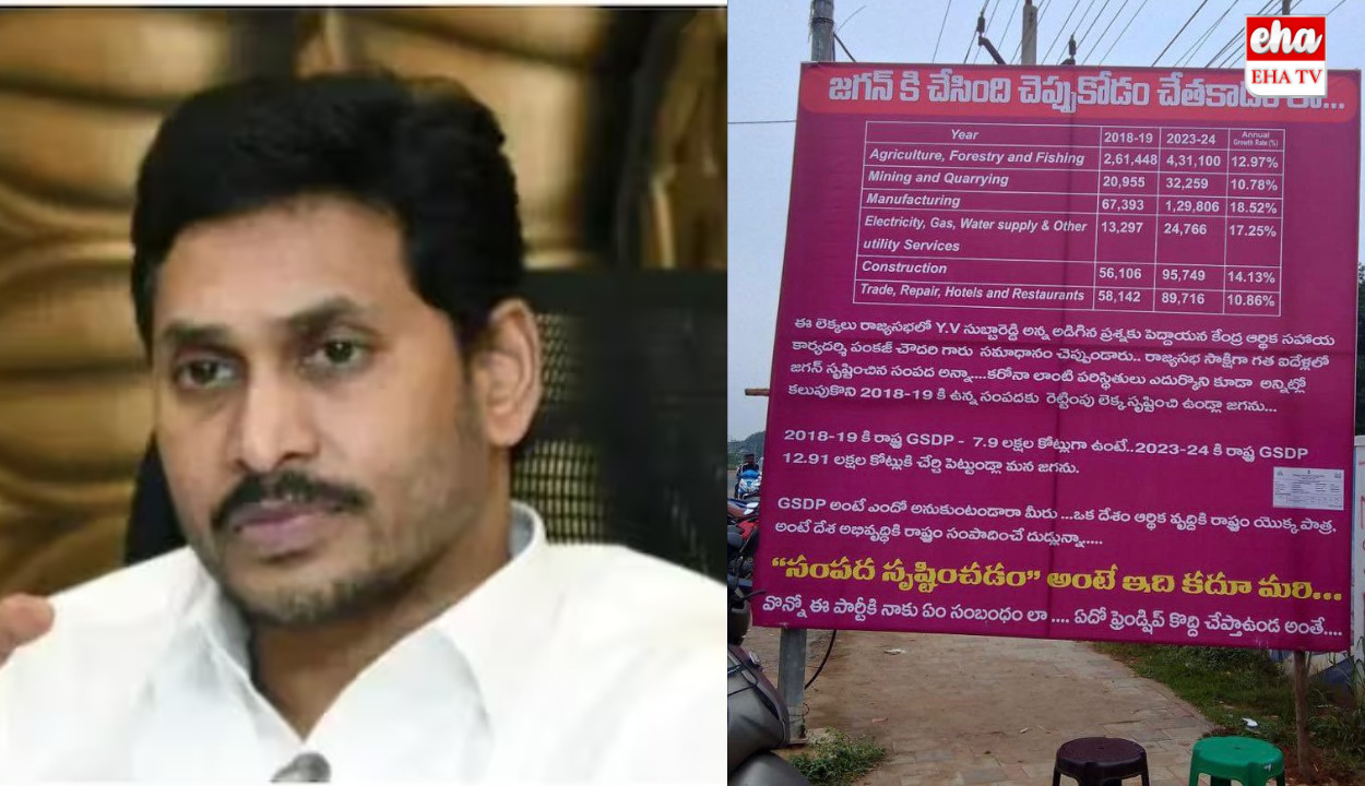 కడపలో జగన్ ప్రభుత్వం, విజయాలపై ఏర్పాటు చేసిన ఫ్లెక్సీపై ఆసక్తికరమైన చర్చ జరుగుతోంది. 'జగన్కు చేసింది చెప్పుకోవడం చేతకాడం లా' అంటూ ఓ ఫ్లెక్సీని గుర్తుతెలియని వ్యక్తులు ఏర్పాటు చేశారు. 'వొన్నో ఈ పార్టీకి నాకు ఏం సంబంధం లా.. ఏదో ఫ్రెండ్షిప్ కొద్ది చేప్తా ఉండ అంతే' అని ఫ్లెక్సీ చివర రాశారు. 2018-19లో టీడీపీ హయాంతో పోలుస్తూ వైసీపీ పరిపాలనలో పెరిగిన సంపదను లెక్కలతో సహా ఆ ఫ్లెక్సీలో వివరించారు. రాజ్యసభలో వైసీపీ ఎంపీ వైవీ సుబ్బారెడ్డి అడిగిన ప్రశ్నలకు కేంద్ర ఆర్థిక శాఖ సహాయ మంత్రి సమాధానాలను ఫ్లెక్సీ రూపంలో రాయలసీమ యాసలో ఏర్పాటు చేశారు. రాజ్యసభ సాక్షిగా గత ఐదేళ్లలో జగన్ సృష్టించిన సంపద అన్నా.. కరోనా లాంటి ప్రతి కూల పరిస్థితులు ఎదుర్కొని కూడా అన్నిట్లో కలుపుకొని 2018-19కి ఉన్న సంపదకు రెట్టింపు లెక్క సృష్టించి ఉండ్లా జగన్ అంటూ ఫ్లెక్సీలో ఉంది. 2018-19కి రాష్ట్ర GSDP – 7.9 లక్షల కోట్లుగా వుంటే, 2023-24 కి రాష్ట్ర GSDP 12.91 లక్షల కోట్లుకి చేర్చి పెట్టుండ్లా మన జగన్. GSDP అంటే ఎందో అనుకుంటండారా మీరు.. ఒక దేశం ఆర్థిక వృద్ధికి రాష్ట్రం యొక్క పాత్ర. అంటే దేశ అభివృద్ధికి రాష్ట్రం సంపాదించే దుడ్లున్నా..