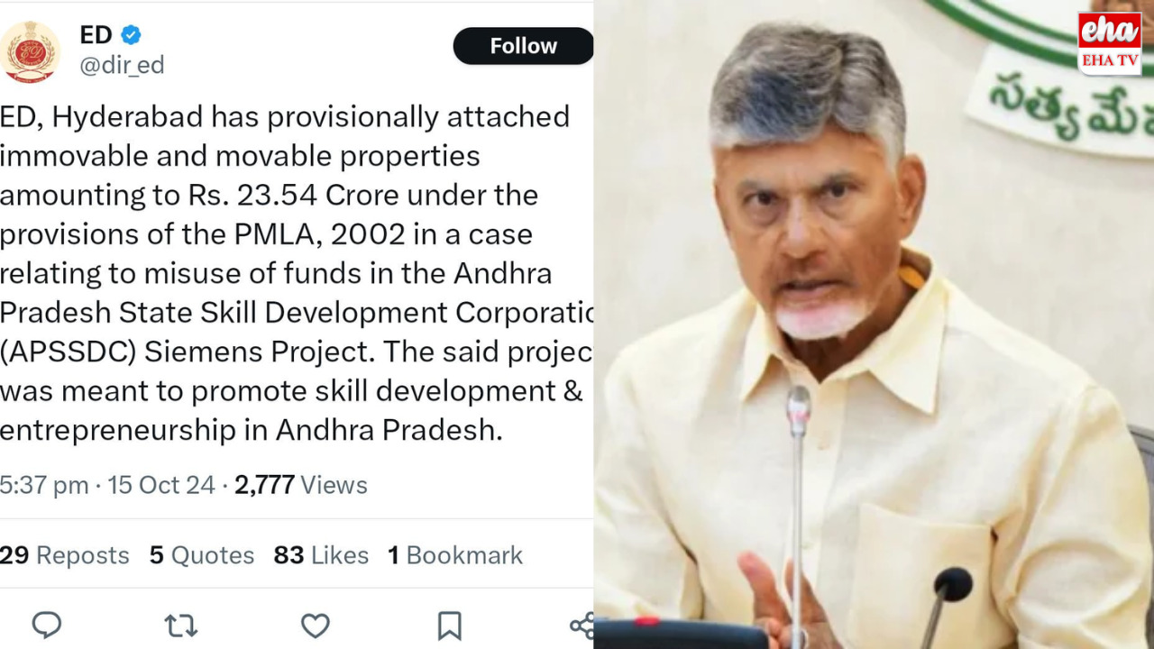 ఏపీ స్కిల్ డెవలప్మెంట్ కార్పొరేషన్ (APSSDC) కుంభకోణం కేసు ముగిసిన అధ్యాయమని తెలుగుదేశంపార్టీ భావిస్తూ వచ్చింది. ఎన్డీయే(NDA) సర్కారు తమను ఏమీ చేయలేదన్న భరోసాతో చంద్రబాబునాయుడు(Chandrababu Naidu) కూడా ఉన్నారు. కాకపోతే ఎన్ఫోర్స్మెంట్ డైరెక్టరేట్ చేసిన ఓ ట్వీట్తో టీడీపీ(TDP) ఉలిక్కిపడింది. అలాచ్మెంట్కు సంబంధించిన ఆ ట్వీట్ భయాన్ని కూడా కల్పించింది. ఆంధ్రప్రదేశ్ స్కిల్ డెవలప్మెంట్ కార్పొరేషన్- సీమెన్స్ ప్రాజెక్టులో నిధుల దుర్వినియోగానికి సంబంధించి 23.54 కోట్ల రూపాయల విలువైన ఆస్తులను అటాచ్ చేసినట్టు ఈడీ ట్వీట్ చేసింది. దీంతో టీడీపీలో కలవరం మొదలయ్యింది. చంద్రబాబు అరెస్ట్ అయ్యింది ఈ కేసులోనే! 52 రోజుల పాటు రాజమండ్రి జైలులో ఉండాల్సిన పరిస్థితి ఏర్పడింది. చంద్రబాబు వర్గీయులకు సహకరించిన షెల్ కంపెనీ డిజైన్ టెక్ ఎండీ వికాస్ వినాయక్ కన్విల్కర్, సీమెన్స్ కంపెనీ అప్పటి ఎండీ సుమన్ బోస్కు చెందిన వివిధ ప్రాంతాల్లోని రూ.23.54 కోట్ల విలువైన స్థిర, చరాస్తులను ఈడీ అటాచ్ చేసింది. ఇంతకు ముందు ఇదే కేసులో డిజైన్ టెక్కు చెందిన రూ.31.20 కోట్ల విలువైన ఆస్తులను ఈడీ అటాచ్ చేసింది. అంటే మొత్తం 54.74 కోట్ల రూపాయల విలువైన ఆస్తులను అటాచ్ చేసిందన్నమాట! ఈడీ చేసిన ఆ చిన్న ట్వీట్ ఏపీ రాజకీయాలలో ప్రకంపనాలు రేపుతోంది. చంద్రబాబు అరెస్ట్ అయిన స్కిల్ కేసు కావడమే అందుకు కారణం. చంద్రబాబు అవినీతికి పాల్పడ్డారనడానికి ఈ అటాచ్లే రుజువు అని వైసీపీ(YCP) నాయకులు అంటున్నారు. చంద్రబాబుకు ఏ మాత్రం సంబంధం లేదని ఈడీ అధికారులు చెప్పారని ఎప్పటిలాగే టీడీపీ అనుకూల మీడియా ప్రచారం చేస్తోంది.