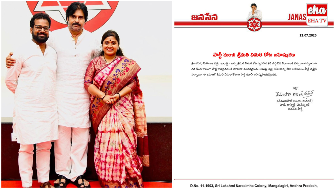 జనసేన పార్టీ అధ్యక్షుడు పవన్ కళ్యాణ్ ఆధ్వర్యంలోని నాయకత్వం, పార్టీ విధివిధానాలకు విరుద్ధంగా వ్యవహరించిన ఎవరినైనా సరే, కఠిన చర్యలు తీసుకోవడంలో ఎప్పుడూ వెనుకాడలేదు. వినూత కోట వ్యవహార శైలి గత కొంతకాలంగా పార్టీ సిద్ధాంతాలకు భిన్నంగా ఉన్నట్లు గుర్తించిన నేపథ్యంలో, ఆమెను పార్టీ కార్యక్రమాల నుండి దూరంగా ఉంచారు. ఈ హత్య కేసు వెలుగులోకి రావడంతో, ఆమెను పార్టీ నుండి సస్పెండ్ చేయాలని నిర్ణయించారు. ఈ విషయాన్ని జనసేన పార్టీ అధికారికంగా ధృవీకరించింది.
