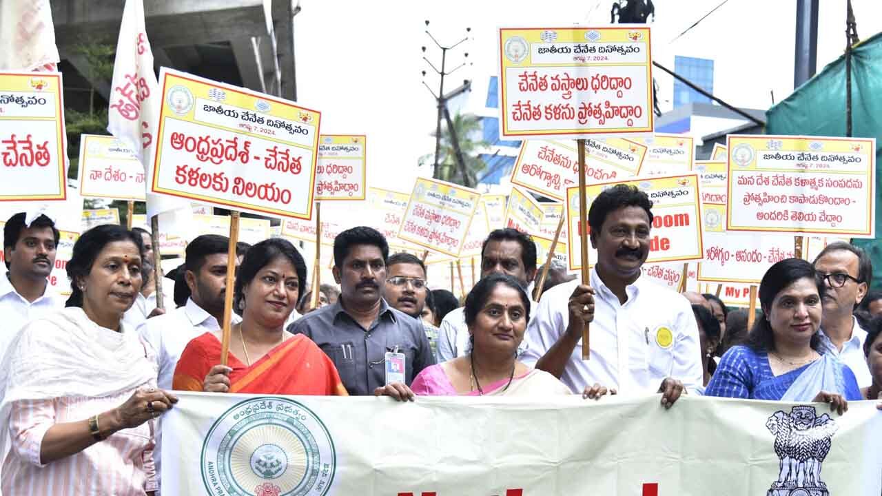 రాష్ట్రంలో చేనేతకు పూర్వ వైభవం తెచ్చేందుకు రాష్ట్ర ముఖ్యమంత్రి చంద్రబాబు నేతృత్వంలోని ప్రభుత్వం కృషిచేస్తోందని గౌరవ రాష్ట్ర చేనేత, జౌళి; బీసీ సంక్షేమ శాఖ మంత్రి ఎస్ సవిత అన్నారు. బుధవారం జాతీయ చేనేత దినోత్సవాన్ని పురస్కరించుకొని చేనేత, జౌళి శాఖ ఆధ్వర్యంలో నగరంలోని మేరీస్ స్టెల్లా కాలేజీ వద్ద ప్రత్యేక కార్యక్రమం జరిగింది. ఈ సందర్భంగా రాష్ట్ర చేనేత, జౌళి; బీసీ సంక్షేమ శాఖ మంత్రి ఎస్.సవిత పలువురు అధికారులతో కలిసి చేనేత వాకథాన్ను ప్రారంభించారు. చేనేత వస్త్రాలు ధరిద్దాం.. చేనేత కళను ప్రోత్సహిద్దామంటూ పిలుపునిచ్చారు.