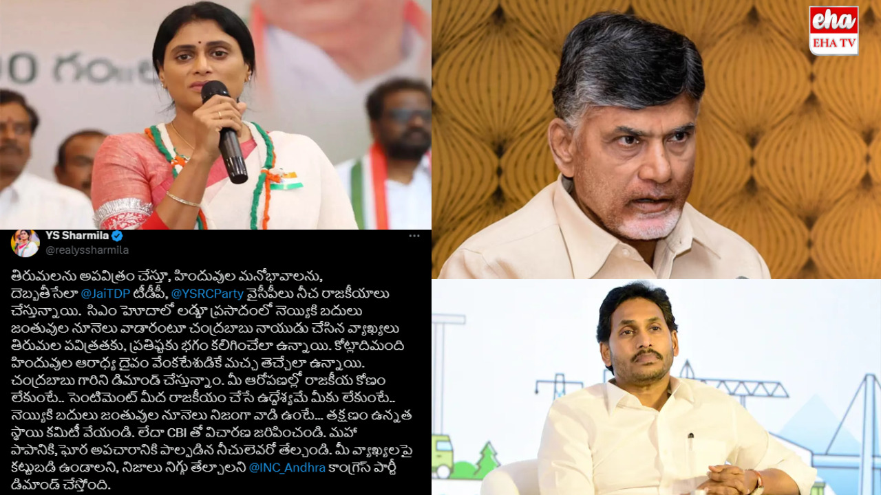 తిరుమలను అపవిత్రం చేస్తూ, హిందువుల మనోభావాలను దెబ్బతీసేలా తెలుగుదేశంపార్టీ(TDP), వైఎస్ఆర్ కాంగ్రెస్ పార్టీలు(YCP) నీచ రాజకీయాలు చేస్తున్నాయని ఏపీ కాంగ్రెస్ అధ్యక్షురాలు వై.ఎస్.షర్మిల(YS Sharmila) విమర్శించారు. ముఖ్యమంత్రి హోదాలో లడ్డూ ప్రసాదంలో నెయ్యికి బదులు జంతువుల నూనెలు వాడారంటూ చంద్రబాబు నాయుడు(Chandra Babu) చేసిన వ్యాఖ్యలు తిరుమల పవిత్రతకు, ప్రతిష్టకు భగం కలిగించేలా ఉన్నాయన్నారు. ఈ మేరకు ఎక్స్లో ఆమె ఓ పోస్ట్ పెట్టారు. ఎక్స్లో షర్మిల ఇంకా ఏమన్నారంటే 'కోట్లాదిమంది హిందువుల ఆరాధ్య దైవం వేంకటేశుడికే మచ్చ తెచ్చేలా ఉన్నాయి. చంద్రబాబు గారిని డిమాండ్ చేస్తున్నాం. మీ ఆరోపణల్లో రాజకీయ కోణం లేకుంటే.. సెంటిమెంట్ మీద రాజకీయం చేసే ఉద్దేశ్యమే మీకు లేకుంటే.. నెయ్యికి బదులు జంతువుల నూనెలు నిజంగా వాడి ఉంటే..తక్షణం ఉన్నత స్థాయి కమిటీ వేయండి. లేదా CBI తో విచారణ జరిపించండి. మహా పాపానికి,ఘోర అపచారానికి పాల్పడిన నీచులెవరో తేల్చండి. మీ వ్యాఖ్యలపై కట్టుబడి ఉండాలని, నిజాలు నిగ్గు తేల్చాలని కాంగ్రెస్ పార్టీ డిమాండ్ చేస్తోంది.