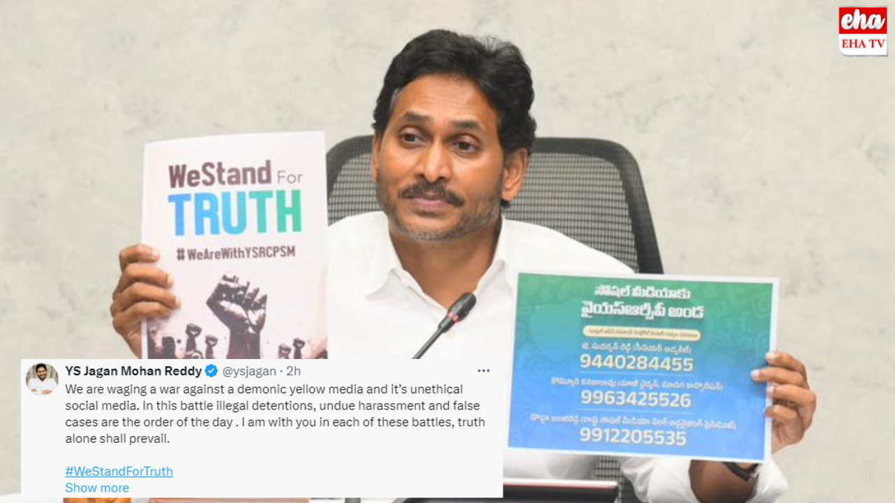 రాక్షస ఎల్లో మీడియా(Yellow MEdia), సోషల్ మీడియాకు(Social media) వ్యతిరేకంగా పోరాడుతున్నామని జగన్(YS Jagan) అన్నారు. ఈ పోరాటంలో కేసులు, వేధింపులు, నిర్భంధాలుంటాయని వీటిని ఎదుర్కొనేందుకు సిద్ధంగా ఉంటానని జగన్ అన్నారు. కేసులు పెడితే కార్యకర్తలకు అండగా ఉంటా.. అంతిమంగా