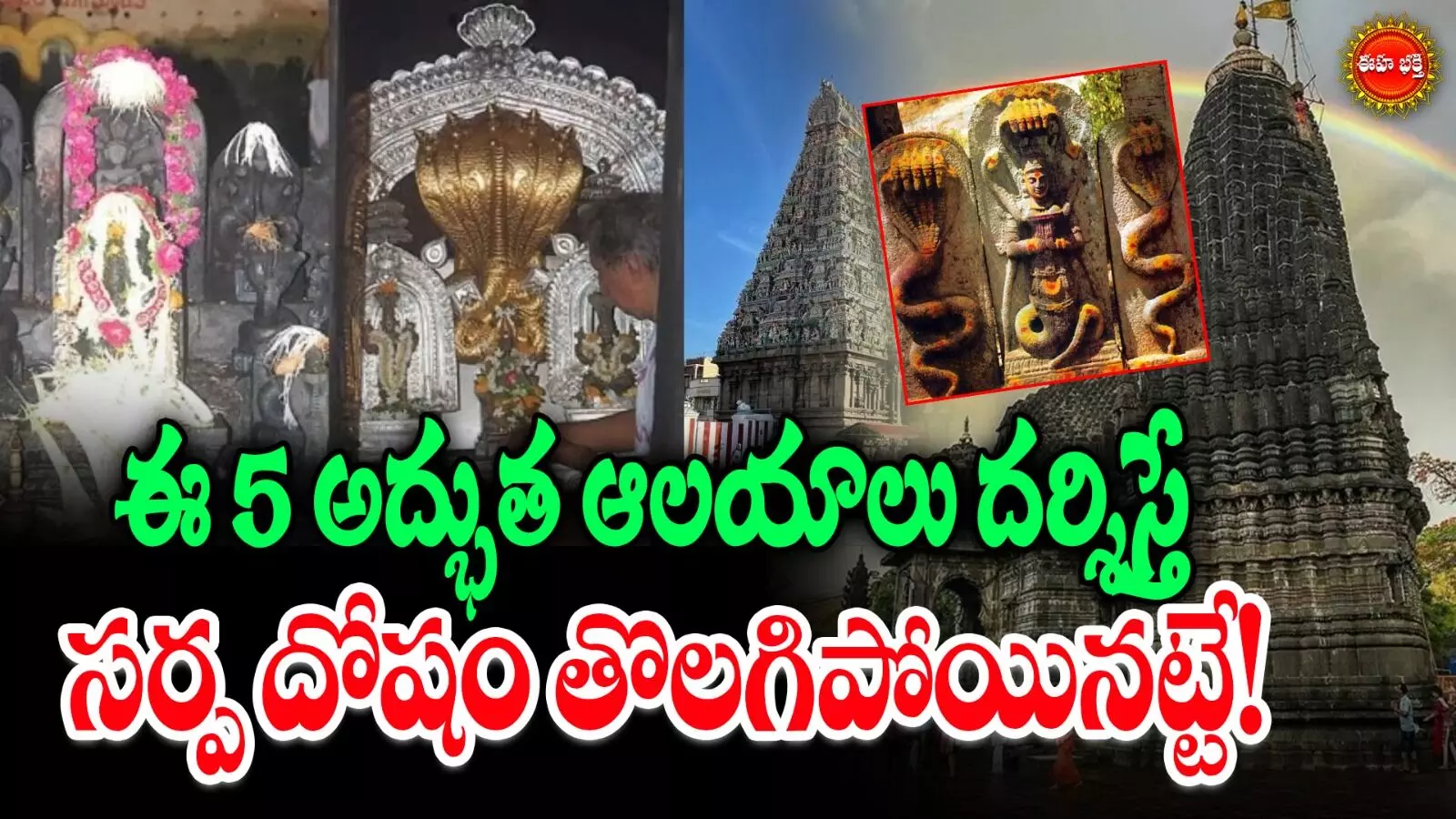 సర్పదోషం నివారణకు తప్పక దర్శించాల్సిన ఐదు అద్భుత ఆలయాలు ఇవే. శ్రీకాళహస్తీశ్వర ఆలయం, ఈ ఆలయం శివునికి అంకితం చేయబడింది. సర్పదోషంలో కీలకమైన రాహు కేతువుల సంబంధానికి ప్రసిద్ధి చెందింది. కాల సర్ప దోషం ప్రభావాలను తగ్గించడానికి ఇక్కడ