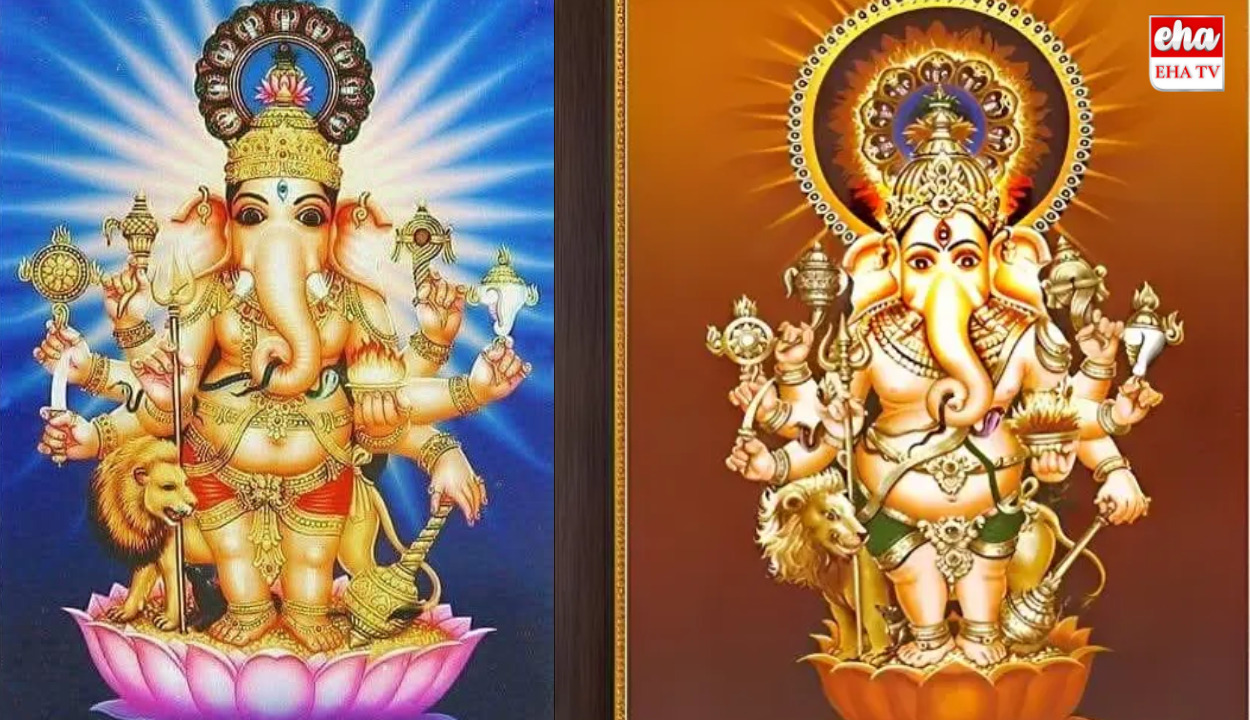ఇతర దేవతల వలె అనేక ఆయుధాలను ధరించి, సింహమును వాహనంగా చేసుకుని వుంటాడు. మూషికము కూడా ఈయన పాదాల చెంత వుంటుంది. మహా పరాక్రమశాలి రూపంతో ఈ మహాగణపతి పూర్ణ వికసిత పద్మంలో విజయోత్సాహ వీరునిలా నిలబడి వుంటాడు. తొమ్మిది నాగదేవతలు ఈయన తలచుట్టూ తిరిగి వుంటారు.