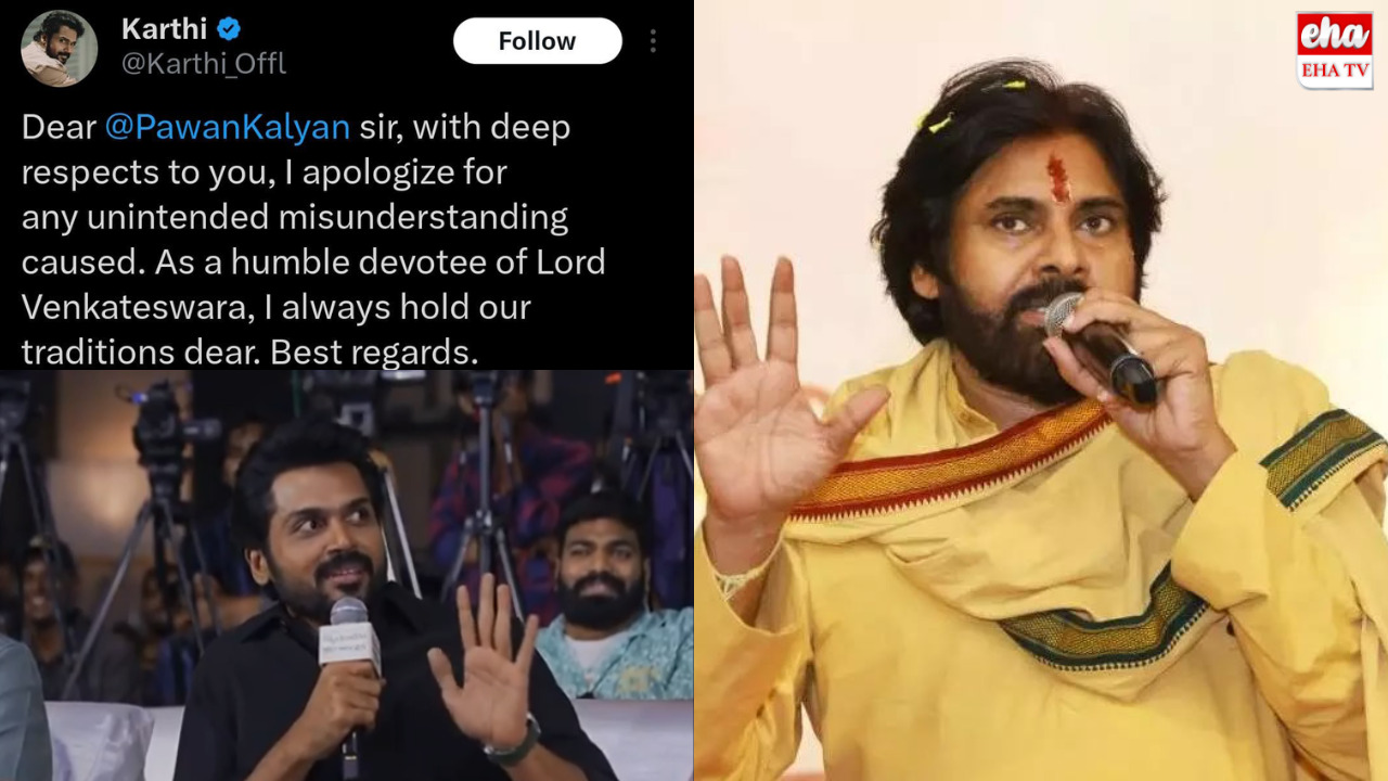 తిరుమల లడ్డూ(Tirumala Laddu) వివాదంలో కోలీవుడ్ హీరో కార్తీని(Karthi) కూడా లాగేసిన పవన్ కల్యాణ్(Pawan kalyan) లడ్డూను అపహాస్యం చేయకూడదని ఆయనను హెచ్చరించిన విషయం తెలిసిందే. లడ్డూ సెన్సిటీవ్ ఇష్యూ అన్న కార్తీని ఇంకోసారి అలా అనకూడదని పవన్ చెప్పారు. ఇది జరిగిన కాసేపటికే కార్తీ రియాక్టరయ్యారు. పవన్ కల్యాణ్కు క్షమాపణలు చెప్పారు. తన వ్యాఖ్యలను తప్పుగా అర్థం చేసుకున్నారని, తాను వేంకటేశ్వరస్వామికి పరమ భక్తుడిని అని, సంస్కృతీ సంప్రదాయాలను పాటించేవాడినని కార్తీ అన్నారు. ఈ మేరకు సోషల్ మీడియాలో ఓ పోస్ట్ పెట్టారు.