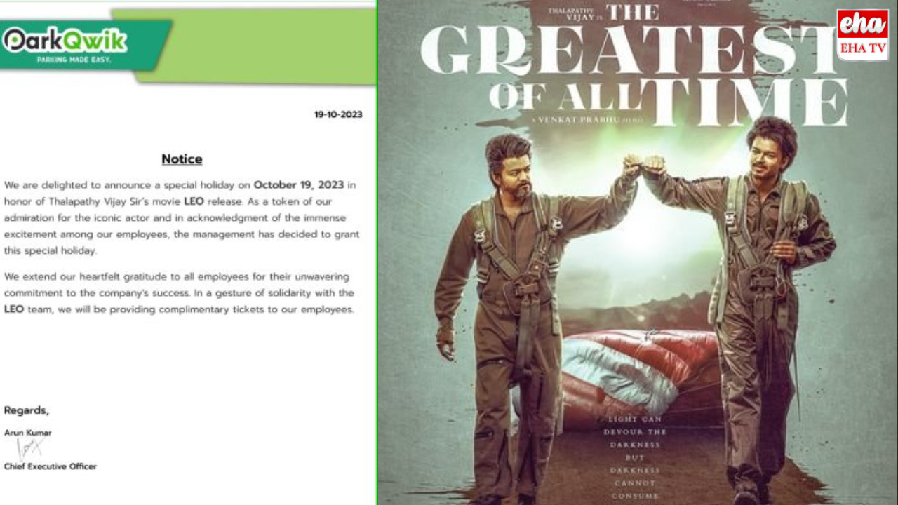 'సెప్టెంబర్ 05, 2024న దళపతి విజయ్ సినిమా ది గోట్ విడుదల అవుతున్నది. ఈ సందర్భంగా.. మా కంపెనీ ఉద్యోగులకు ప్రత్యేక సెలవు దినాన్ని ప్రకటిస్తున్నాం. విజయ్ సర్పై ఉన్న అభిమానానికి చిహ్నంగా, అలాగే మా ఉద్యోగులలో ఉన్న అపారమైన ఉత్సాహానికి గుర్తుగా, యాజమాన్యం ఈ ప్రత్యేక సెలవును మంజూరు చేయాలని నిర్ణయించింది. సినిమా హిట్ కావాలని ది గోట్ చిత్ర బృందానికి మా విషెస్ తెలుపుతున్నాం. అలాగే ఈ సినిమాకు సంబంధించి మా ఉద్యోగులకు కాంప్లిమెంటరీ టిక్కెట్లను కూడా అందించబోతున్నాం' అంటూ పార్క్విక్(Parkqwik) సీఈఓ అరుణ్ కుమార్(Arun Kumar) సోషల్ మీడియాలో ఓ పోస్ట్ పెట్టారు.