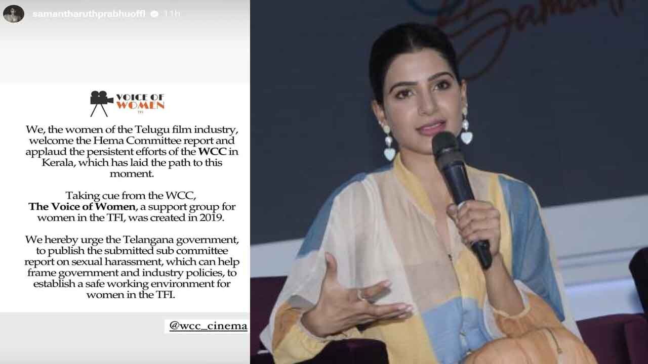 టాలీవుడ్లో మహిళల సమస్యలపై పోరాడేందుకు ఏర్పడిన 'ది వాయిస్ ఆఫ్ ఉమెన్' సమర్పించిన సబ్ కమిటీ నివేదికను వెల్లడించాలని నటి సమంతా రూత్ ప్రభు తెలంగాణ ప్రభుత్వాన్ని కోరారు. హేమ కమిటీ నివేదికను స్వాగతించిన సమంత.. లైంగిక వేధింపులకు వ్యతిరేకంగా ఉద్యమాన్ని ముందుకు తీసుకెళ్లడంలో కేరళలోని విమెన్ ఇన్ సినిమా కలెక్టివ్ (డబ్ల్యుసిసి) పాత్రను ప్రశంసించారు. అలాగే.. 2019లో స్థాపించబడిన తెలుగు చలనచిత్ర పరిశ్రమలో ఏర్పాటైన 'ది వాయిస్ ఆఫ్ ఉమెన్ బ్ కమిటీ' నివేదికను విడుదల చేయాలని తెలంగాణ ప్రభుత్వాన్ని కోరింది. తెలుగు చిత్ర పరిశ్రమలో మహిళలకు సురక్షితమైన పని వాతావరణాన్ని కల్పించేందుకు.. పరిశ్రమ విధానాలను రూపొందించడంలో ఈ నివేదిక సహాయపడుతుందని తన అభిప్రాయాన్ని వ్యక్తపరిచింది. ఇన్స్టాగ్రామ్లో సబ్కమిటీ నివేదిక విడుదల చేయాలని కోరుతూ సమంత ఒక పోస్టు చేసింది. యాంకర్, టాలీవుడ్ నటి ఝాన్సీ కూడా సమంత పోస్ట్కు మద్దతు తెలియజేశారు.