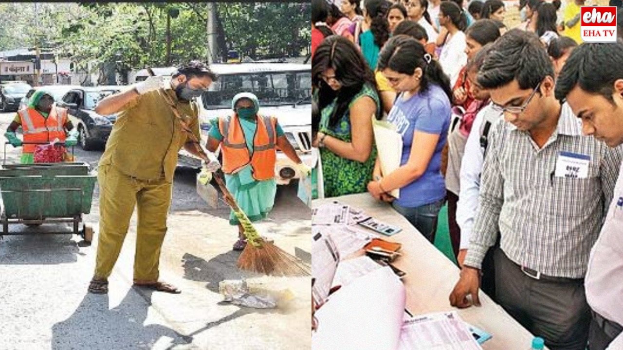 మన దేశంలో నిరుద్యోగం(Unemployeement) ఎంత తీవ్ర స్థాయిలో ఉందో ఈ వార్త చూస్తే తెలుస్తోంది. నిరుద్యోగులకు ఉపాధి అవకాశాలు కల్పిస్తామని ప్రభుత్వాలు ఎన్ని గొప్పలు చెప్పకున్నా నిరుద్యోగ సమస్య రోజురోజుకు పెరిగిపోతూనే ఉంది. పాలకులు ఎన్ని ప్రగల్భాలు పలికినా ఈ దేశంలో నిరుద్యోగ స్థాయి ఈ స్థాయిలో ఉందని చెప్పడానికి ఇదో ఉదాహరణ. హర్యానా(Haryana) ప్రభుత్వం పలు కార్పొరేషన్లు, ప్రభుత్వశాఖలు, బోర్డుల ఆధ్వర్యంలో నడిచే ఆఫీసుల్లో స్వీపర్ పోస్టులకు(Sweeper Jobs) నోటిఫికేషన్ ఇచ్చింది. పోస్టుల సంఖ్య బహిర్గతం చేయలేదు. ఈ ఉద్యోగాలకు 12వ తరగతి వరకు చదివిన 1.2 లక్షల మంది అభ్యర్థులతో పాటు 46,000 మంది పోస్ట్ గ్రాడ్యుయేట్లు, 6,000 మంది గ్రాడ్యుయేట్లు పోస్టింగ్ కోసం దరఖాస్తు చేసుకున్నారు. అభ్యర్థులు హర్యానా ప్రభుత్వ శాఖలు, కార్పొరేషన్లు, బోర్డులు మరియు పౌర సంస్థల క్లీన్ ఆఫీసులకు స్వీపర్ ఉద్యోగ పోస్టింగ్ కోసం దరఖాస్తు చేసుకున్నారు.