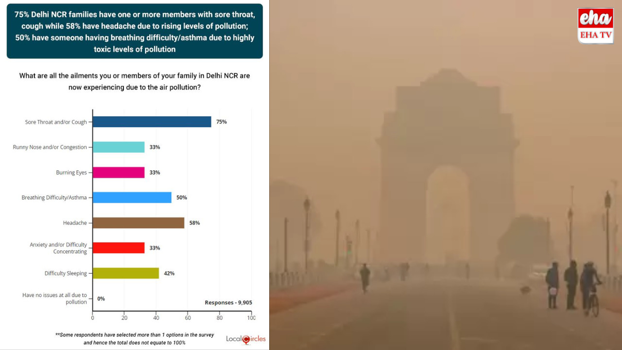 ఢిల్లీ ఎన్సిఆర్(Delhi NCR) ప్రాంతంలోని గాలి నాణ్యత(Air Quality) క్షీణించడంతో ఇబ్బందులు పడుతున్న ప్రతి ఒక్క కుటుంబంలో ఒకరు కంటే ఎక్కువ కాలుష్య సంబంధిత ఆరోగ్య రుగ్మతలతో బాధపడుతున్నారని తాజా సర్వే తెలిపింది. ఆన్లైన్ కమ్యూనిటీ ప్లాట్ఫారమ్ అయిన లోకల్సర్కిల్స్(Online Circle) నిర్వహించిన సర్వేలో, ఈ ప్రాంతంలోని 75% కుటుంబాల్లో ఒకరు లేదా అంతకంటే ఎక్కువ మంది సభ్యులు గొంతు నొప్పి లేదా దగ్గుతో బాధపడుతున్నారని ఇటీవలి సర్వే(Survey) తెలిపింది. సర్వే చేసిన కుటుంబాల్లో 58 శాతం మంది అత్యంత విషపూరితమైన కాలుష్య స్థాయిల కారణంగా తలనొప్పిని(Head ache) ఎదుర్కొంటున్నారని నివేదించారు, అయితే 50 శాతం మంది కుటుంబ సభ్యులు శ్వాస తీసుకోవడంలో ఇబ్బందులు(Respiration problems) లేదా ఆస్తమాతో(Astma) బాధపడుతున్నారు. ఈ సర్వే ఢిల్లీ, గురుగ్రామ్(Gurugroan), నోయిడా(Noida), ఫరీదాబాద్(Pharidabad), ఘజియాబాద్లోని(haziabad) 21,000 మంది నివాసితుల వివరాలు సేకరించింది. ఈ 21,000 మంది ప్రతివాదులలో 63 శాతం మంది పురుషులు, 37 శాతం మంది మహిళలు ఉన్నారు.