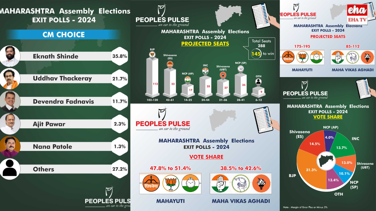 మహారాష్ట్ర అసెంబ్లీ ఎన్నికలు ‘మహా’సంగ్రామాన్ని తలపించాయి. దేశ ఆర్థిక రంగానికి గుండెకాయలాంటి ముంబాయి నగరాన్ని రాజధానిగా కలిగున్న రాష్ట్రంలో అసెంబ్లీ ఎన్నికలు జాతీయ పార్టీలైన బీజేపీ, కాంగ్రెస్లకు ప్రతిష్టాత్మకంగా మారాయి. 2019లో అసెంబ్లీ ఎన్నికల తర్వాత ప్రాంతీయ పార్టీలు శివసేన, ఎన్సీపీలు చీలిపోయి చెరో వర్గం బీజేపీ, కాంగ్రెస్ పంచన చేరడంతో 2024 అసెంబ్లీ ఎన్నికలు రసవత్తరంగా మారాయి. బీజేపీ, శివసేన (ఏక్నాథ్ శిండే), ఎన్సీపీ (అజిత్ పవార్) పార్టీలతో కూడిన మహాయుతి, కాంగ్రెస్, శివసేన (ఉద్దవ్ఠాక్రే), ఎన్సీపీ (శరద్ పవార్) పార్టీలతో కూడిన మహా వికాస్ అఘాఢీ(ఎమ్వీఏ) కూటములు ఎన్నికల్లో నువ్వా నేనా అన్నట్టు తలపడ్డాయి. ‘మహా’సంగ్రామంపై క్షేత్రస్థాయిలో పీపుల్స్ పల్స్ రీసెర్చ్ సంస్థ నిర్వహించిన ఎగ్జిట్ పోల్లో పోటాపోటీగా జరిగిన అసెంబ్లీ ఎన్నికల్లో ‘మహాయుతి’ విజయం సాధించి మరోసారి అధికారపగ్గాలు చేపట్టే అవకాశాలున్నాయని తేలింది. 288 స్థానాలున్న మహారాష్ట్రలో మెజార్టీకి కావాల్సిన మాజిక్ ఫిగర్ 145. పీపుల్స్పల్స్ ఎగ్జిట్ పోల్ సర్వే ప్రకారం మహాయుతి కూటమికి 182 (175 -195) సీట్లు, ఎమ్వీఏ కూటమికి 97(85 -112) సీట్లు, ఇతరులుకు 9 (7 -12) సీట్లు వచ్చే అవకాశాలున్నాయి. మహారాష్ట్రలో బీజేపీ అతిపెద్దగా అవతరించే అవకాశాలున్నాట్టు పీపుల్పల్స్ ఎగ్జిట్ పోల్లో వెల్లడైంది. బీజేపీ 113(102 నుండి 120) స్థానాలు, శివసేన (ఏక్నాథ్ షిండే) పార్టీ 52 (42 నుండి 61) స్థానాలు, ఎన్సీపీ (అజిత్ పవార్) పార్టీ 17(14 నుండి 25) స్థానాలు, కాంగ్రెస్ 35(24 నుండి 44) స్థానాలు, శివసేన (యూబీటీ) 27(21 నుండి 36) స్థానాలు, ఎన్సీపీ (ఎస్పీ) 35 (28 నుండి 41) స్థానాలు, ఇతరులు 9 (6 నుండి 12) స్థానాలు గెలిచే అవకాశాలున్నాయి. మహాయుతికి 49.8 శాతం, ఎమ్వీఏ 40.1 శాతం, ఇతరులకు 10.1 శాతం ఓట్లు వచ్చే అవకాశాలున్నాయి. బీజేపీ 31.3 శాతం, శివసేన (షిండే) 14.5 శాతం, ఎన్సీపీ (ఏపీ) 4 శాతం, కాంగ్రెస్ 13.7 శాతం, శివసేన (యూబీటీ) 13 శాతం, ఎన్సీపీ (ఎస్పీ) 10.1 శాతం, ఇతరులు 13.4 శాతం ఓట్లు పొందే అవకాశాలున్నాయిని ఎగ్జిట్ పోల్లో తేలింది. ముఖ్యమంత్రిగా ఎవరికి ప్రాధాన్యతిస్తారని ఓటర్లను ప్రశ్నించగా ఏక్నాథ్ శిండేకు 35.8 శాతం, ఉద్దవ్ ఠాక్రేకు 21.7 శాతం, దేవంద్ర ఫడ్నవీస్కు 11.7 శాతం, రాజ్థాక్రేకు 2.9 శాతం, అజిత్ పవార్కు 2.3 శాతం, జయంత్ పాటిల్కు 2.1 శాతం, నానా పాటోల్కు 1.3 శాతం, ప్రకాశ్ అంబేద్కర్కు 1.3 శాతం ఓటర్లు మద్దతిచ్చారు. రాష్ట్రంలో మహిళలు మద్దతు మహాయుతికే లభించింది. మహాయుతికి పట్టణ ప్రాంతాలతో పాటు గ్రామీణ ప్రాంతాల్లో కూడా మద్దతు లభించింది. సామాజిక వర్గాల వారిగా పరిశీలిస్తే ముస్లింలు ఎమ్వీకే మద్దతివ్వగా, ఓబీసీలు మహాయుతివైపు మొగ్గు చూపారు. ఎస్సీల్లో రెండు కూటములకు దాదాపు సమానంగా మద్దతు లభించింది. ఎస్టీలు మహాయుతికే మద్దతు ప్రక