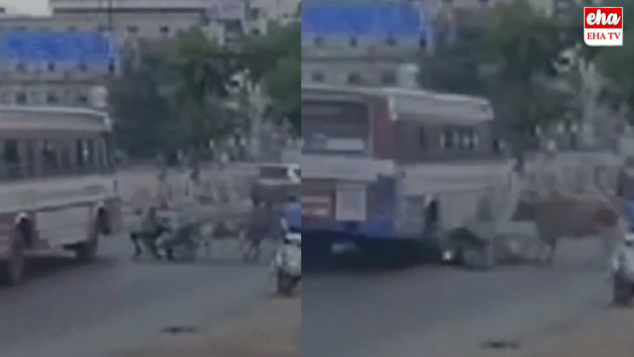 వాన రాకడ ప్రాణం పోకడ ఎవరికీ తెలియదంటారు పెద్దలు. నిజమే చావు ఎప్పుడు తరుముకుని వస్తుందో చెప్పలేం. అందుకు ఈ సంఘటనే పెద్ద ఉదాహరణ. తమిళనాడు(Tamil Nadu)లోని తిరునెల్వేలి(Tirunelveli)లో ఈ విషాద ఘటన చోటు చేసుకుంది. ఓ ప్రాంతంలో రోడ్డు పక్కన రెండు ఆవులు కొట్లాడుకుంటున్నాయి. ఈ క్రమంలో బైక్ మీద వెళుతున్న వేలాయుధరాజ్ను ఓ ఆవు కుమ్మింది. దాంతో అతడు ఎగిరి రోడ్డు మీద పడ్డాడు. అంతలోనే వేగంగా వస్తున్న ఆర్టీసీ బస్సు అతడిపై నుంచి వెళ్లింది. ఈ ప్రమాదంలో అతడు స్పాట్లోనే చనిపోయాడు. ప్రమాదం జరిగిన వెంటనే బస్సు ఆపి డ్రైవర్, స్థానికులు Man Knocked Off Bike By Fighting Cows Crushed By Bus In Tamil Nadu Video Goes Viral On Social Mediaదగ్గరకు పరుగెత్తుకుని వెళ్లారు కానీ, అప్పటికే జరగాల్సిన నష్టం జరిగింది. విషయ తెలిసిన వెంటనే పోలీసులు సంఘటనా స్థలానికి చేరుకున్నారు. వేలాయుధరాజ్ మృతదేహాన్ని పోస్ట్మార్టం కోసం ప్రభుత్వ ఆసుపత్రికి తరలించారు. వేలాయుధరాజ్ మరణానికి కారణమైన ఆవు మాత్రం నింపాదిగా రోడ్డు దాటి వెళ్లిపోయింది. ఈ దృశ్యాలన్నీ సీసీటీవీలో రికార్డయ్యాయి. ప్రస్తుతం ఈ వీడియో సోషల్ మీడియా(Social Media)లో వైరల్ అవుతోంది.