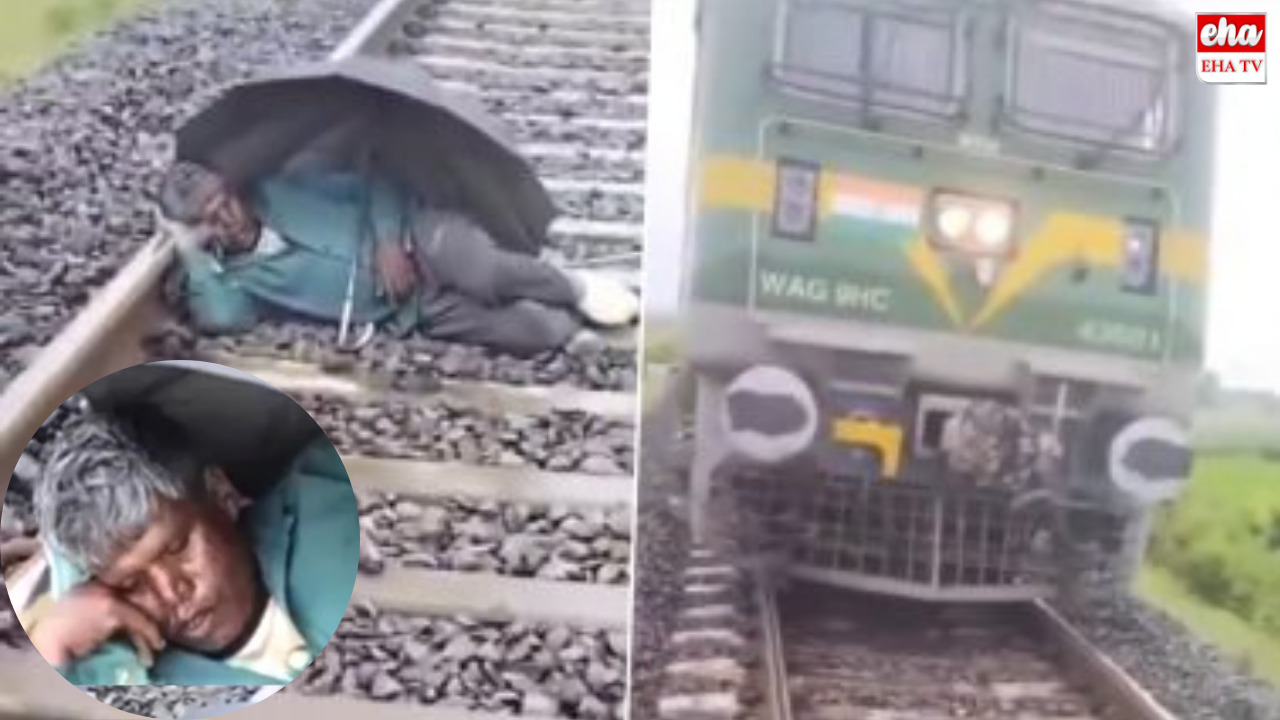యూపీలో దర్జాగా రైల్వే ట్రాక్ మీద గొడుగు వేసుకొని పడుకున్న వ్యక్తి