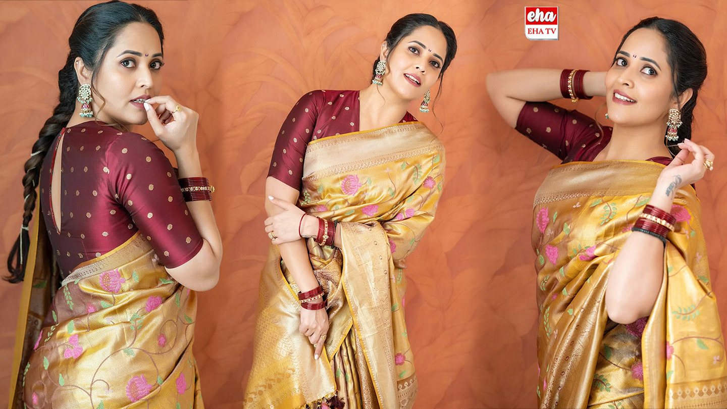 అనసూయ ధరించిన ఈ గోల్డెన్ సిల్క్ చీరపై పింక్, గ్రీన్ రంగుల్లో పూల డిజైన్లు అద్భుతంగా కనిపించాయి.