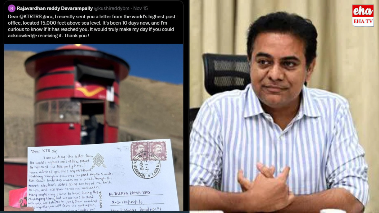 బీఆర్ఎస్(BRS) వర్కింగ్ ప్రెసిడెంట్ కేటీఆర్కు(KTR) రాజవర్ధన్రెడ్డి(Rajavardhan reddy) అనే అభిమాని ప్రపంచంలోనే అత్యంత ఎత్తులో ఉన్న పోస్టాఫీస్(Post office) నుంచి ఉత్తరం(Letter) రాశారు.
