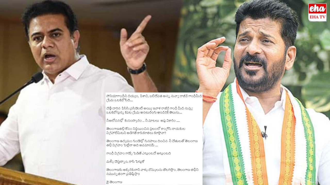 సెక్రటేరియట్లోపల తెలంగాణ తల్లి విగ్రహం(Telangana thalli statue) పెడతామని చెప్పిన తెలంగాణ ముఖ్యమంత్రి రేవంత్రెడ్డి(Revanth reddy) ఇవాళ అందుకోసం భూమి పూజ చేశారు. ఎప్పటిలాగే ఆ కార్యక్రమంలో కూడా బీఆర్ఎస్ను(BRS), ఆ పార్టీ నేతలను అనరాని మాటలు అన్నారు. ఈ క్రమంలో ఎక్స్ (twitter) ద్వారా బీఆర్ఎస్ వర్కింగ్ ప్రెసిడెంట్ కేటీఆర్(KTR) తనదైన శైలిలో జవాబు ఇచ్చారు. సోనియాగాంధీని(Sonia gandhi) దయ్యం, పిశాచి, బలిదేవత అన్న నువ్వా రాజీవ్ గాంధీమీద(Rajiv gandhi) ప్రేమ ఒలకబోసేది అంటూ రేవంత్ను నిలదీశారు. కేటీఆర్ ఎక్స్లో ఇంకా ఏం రాశారంటే 'దొడ్డి దారిన పిసిసి ప్రసిడెంట్ అయ్యి ఇవాళ రాజీవ్ గాంధీ మీద నువ్వు ఒలకబోస్తున్న కపట ప్రేమ అసలురంగు అందరికీ తెలుసు.... నీఆలోచనల్లో కుసంస్కారం ... నీ మాటలు అష్ట వికారం .....తెలంగాణతల్లి కోసం నిర్ణయించిన స్థలంలో కాంగ్రేస్ నాయకుల విగ్రహాలేమిటని అడిగితే కారుకూతలు కూస్తావా? తెలంగాణ ఉద్యమం గుండెల్లో గునపాలు దించిన నీ చేతులతో తెలంగాణ తల్లి విగ్రహం పెట్టినా అది అవమానమే .... గాంధీ విగ్రహం గాడ్సే పెడితే ఎట్లుంటదో అట్లుంటది. మళ్ళీ చెప్తున్నాం, రాసి పెట్టుకో