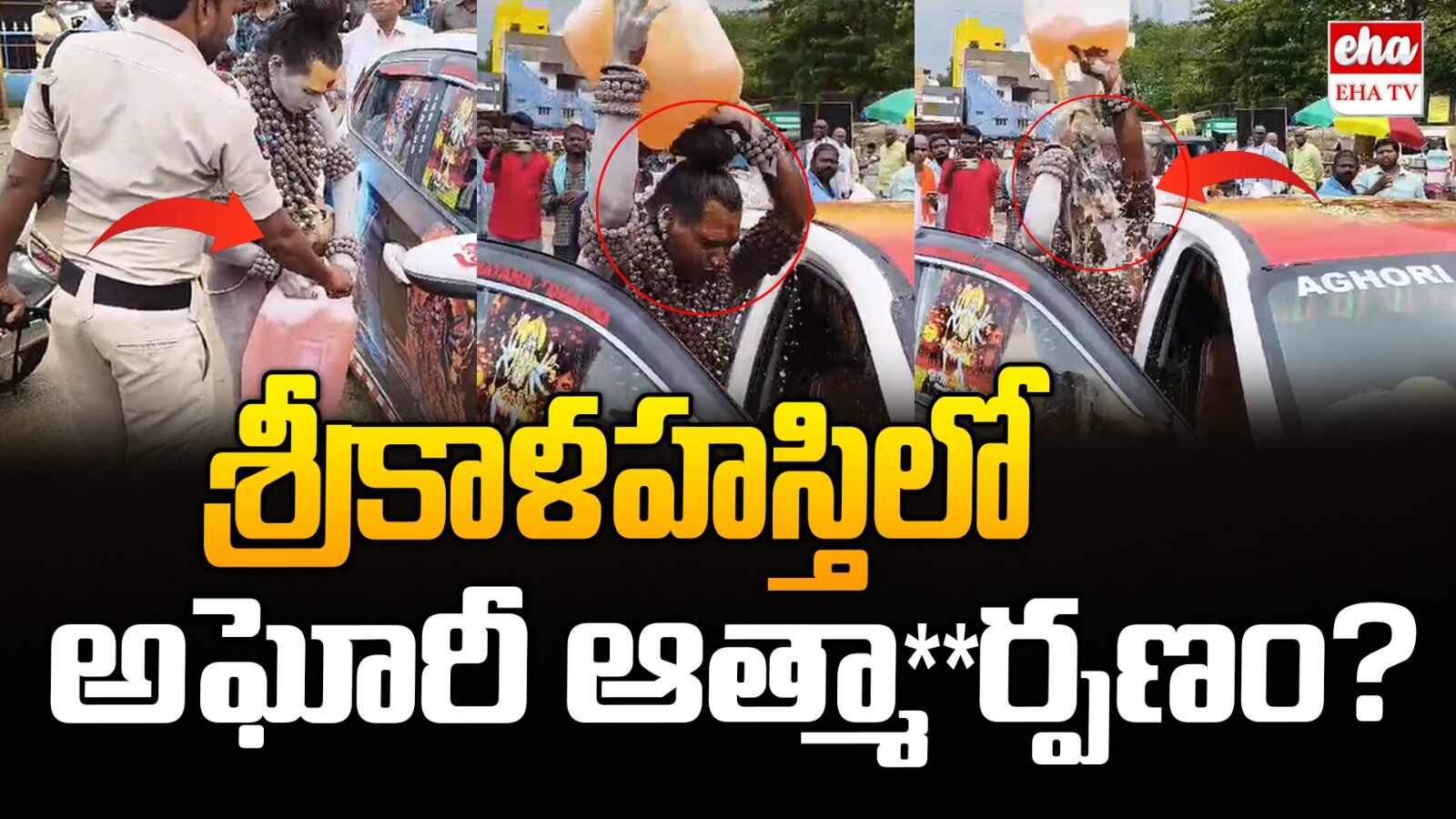 శ్రీ కాళహస్తి(Sri kahalahasti) ఆలయం వద్ద లేడీ అఘోరికీ(Aghori).. భద్రతా సిబ్బంది మద్యన వివాదం. ప్రదాన శివాలయం లోకి వెళ్లాలని ఆలయం వద్దకు చేరుకున్న లేడీ అఘోరీ. ఒంటిపై బట్టలతో(clothes) రావాలని అడ్డుకున్న భద్రతా సిబ్బంది. కాసేపు తీవ్రంగా వాగ్వివాదం చేసిన అఘోరీ... కార్లో తెచ్చుకున్న పెట్రోల్ క్యాన్ ఓపెన్ చేసి. ఆత్మహత్య యత్నంకి(Suicide attempt) పాల్పడిన లేడీ అఘోరీ. వేంటనే అప్రమత్తమైన పోలీసులు.. స్థానికులు, లేడి కానిస్టేబుల్ లతో వంటిపై నీళ్లు పోసీ, దుస్తులు కట్టిన సిబ్బంది.