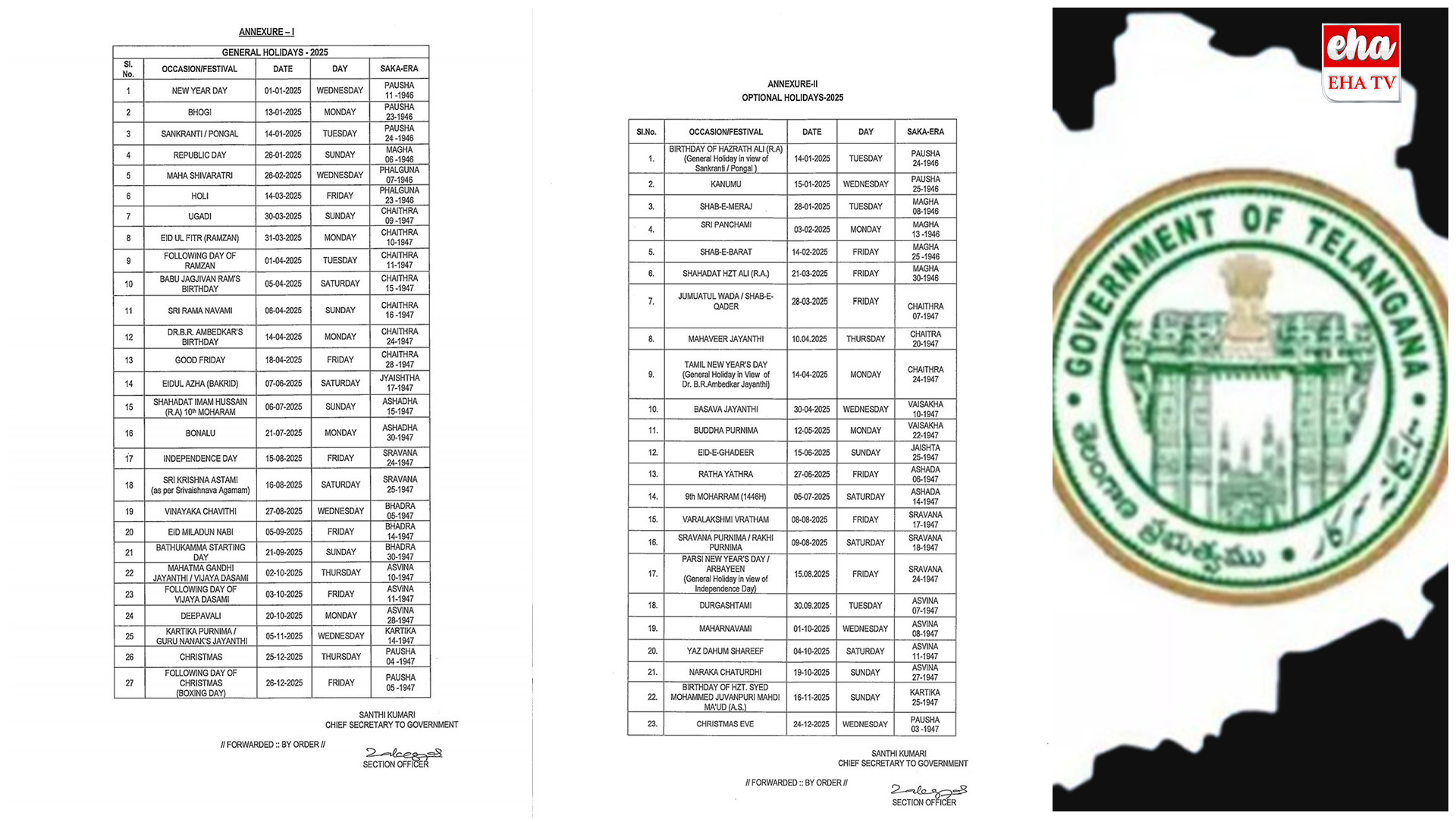 2025 సంవత్సరానికి సెలవుల జాబితా విడుదల చేసిన తెలంగాణ ప్రభుత్వం