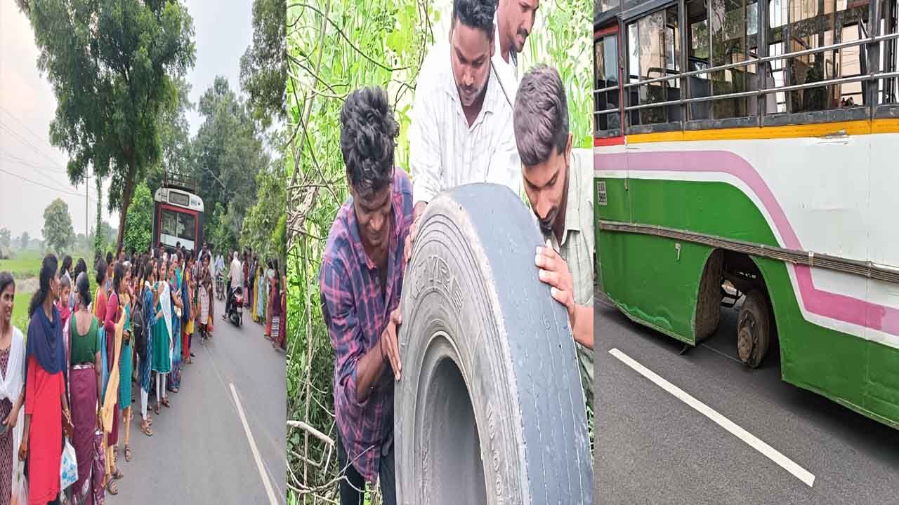 నిర్మల్ జిల్లా మోరపల్లిలో టీజీఎస్ఆర్టీసీ బస్సుకు తృటిలో పెను ప్రమాదం తప్పింది. 170 మంది ప్రయాణికులతో నిర్మల్ బస్ డిపో నుంచి జగిత్యాల వైపు వెళ్తున్న బస్సు టైర్లు ఊడిపోయాయి