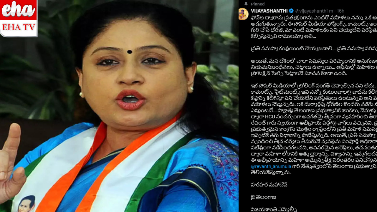 సోషల్ మీడియాలో మహిళల పట్ల చేస్తున్న వ్యాఖ్యలపై కఠిన చర్యలు తీసుకోవాలని విజయశాంతి ఎక్స్ వేదికగా కోరారు. '' ఫోన్ల ద్వారాను ప్రత్యక్షంగాను ఎందరో మహిళలు నన్ను ఒక అంశాన్ని అడుగుతున్నారు. ఈ సోషల్ మీడియా పోస్టింగ్స్, కామెంట్స్ ఇంకా ఎంతో బాధకు గురి చేసే ధోరణి, మా వంటి మహిళలకు పని చెయ్యలేని పరిస్థితులను కల్పిస్తున్నవి రాములమ్మా అని...