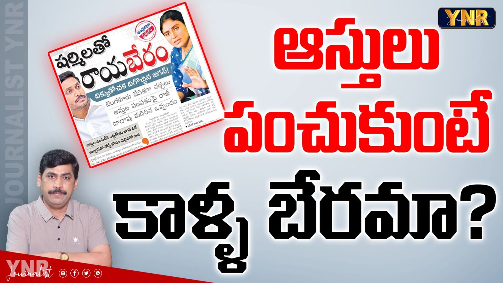 వై.ఎస్.జగన్మోహన్రెడ్డి(YS Jagan), వై.ఎస్.షర్మిల(YS sharmila) రెడ్డి మధ్య ఆస్తుల పంపకానికి(Assests Distributions) సంబంధించిన వ్యవహారం కొలక్కి వచ్చింది. బేరం కుదిరింది. రాయబేరం అంటూ ఓ తెలుగు దిన పత్రిక బ్యానర్ స్టోరీని ప్రచురించింది. చెల్లితో రాయబేరం చేశారు. బేరం కుదిరిందన్నది ఆ వార్త కథనం సారాంశం. వై.ఎస్.జగన్మోహన్రెడ్డికి, వై.ఎస్.షర్మిలా రెడ్డికి మధ్య ఆస్తులకు సంబంధించిన వివాదం ఉన్నదన్నది అందరికీ తెలిసిన విషయమే! ఎవరూ దాచే విషయం కూడా కాదు. సాక్షాత్తూ వై.ఎస్.షర్మిలనే గతంలో ఈ విషయం చెప్పారు. ఏ కుటుంబంలోనైనా ఆస్తులకు సంబంధించిన వివాదాలు ఉంటాయని, తమ కుటుంబంలోనూ ఉన్నాయని, వాటిని తామే సర్దుబాటు చేసుకుంటామని షర్మిల తెలిపారు. గడచిన ఎన్నికల్లో ఆమె కాంగ్రెస్(Congress) పార్టీ రాష్ట్ర చీఫ్గా జగన్మోహన్రెడ్డికి వ్యతిరేకంగా ప్రచారం చేశారు. నరేంద్రమోది(Narendra modi), జగన్ మధ్య సాన్నిహిత్యం ఉందని, ఆంధ్రప్రదేశ్కు సంబంధించినంత వరకు బీజేపీ(BJP) అంటే బాబు, జగన్, పవన్(Pawan kalayn) అంటూ షర్మిల భాష్యం చెప్పారు. ఇప్పుడు జగన్, షర్మిల మధ్య ఆస్తుల పంపకానికి సంబంధించిన చర్చలు జరుగుతున్నాయని, జగన్మోహన్రెడ్డి దిగొచ్చి, కాళ్ల బేరానికి వచ్చారన్నది ఆ పత్రిక రాసిన కథనం. ఒక అన్నా చెల్లెలు మధ్య ఆస్తుల పంపకం జరిగితే కాళ్ల బేరమవుతుందా? ఈ ప్రపంచంలో, ఈ దేశంలో, ఈ రాష్ట్రంలో అన్నదమ్ములు, అన్నా చెల్లెళ్లు ఆస్తులను పంచుకోవడమన్నది కొత్తా? ఆస్తుల పంపకం జరిగితే అది బేరం ఎలా అవుతుంది? ఆస్తుల పంపకానికి ఓ అన్న ముందుకు వస్తే అది కాళ్ల బేరం ఎలా అవుతుంది? సరే, ఇప్పుడు కాళ్ల బేరానికి వెళ్లడం వల్ల జగన్కు వచ్చే లాభమేమిటి? ఒకవేళ జగన్మోహన్రెడ్డి కాంగ్రెస్తో కలవాలనుకుంటే షర్మిల ఆపగలుగుతారా? కాంగ్రెస్ పార్టీ జగన్తో కలిసి పని చేయాలనుకుంటే షర్మిల కాదంటారా? ఆంధ్రప్రదేశ్లో వైఎస్ షర్మిల అంత పవర్ఫుల్లా? అసలు ఆంధ్రప్రదేశ్లో కాంగ్రెస్ పార్టీకి ఉన్న బలమెంత? షర్మిలతోనే పార్టీ పునర్జీవం పొందగలదని నమ్ముతున్న కాంగ్రెస్ వాదులెంత మంది ఉన్నారు? ఎందుకు జగన్ కాళ్లబేరానికి వెళ్లాల్సిన పరిస్థితి వచ్చినట్టు? ఆస్తులు పంచుకుంటుంటే అది కాళ్లబేరం ఎలా అవుతుందో ఆ పత్రికవారికే తెలియాలి? గతంలో చంద్రబాబునాయుడు(chandrababau), ఆయన తమ్ముడు రామ్మూర్తినాయుడు(Ramurthi) మధ్య విభేదాలు వచ్చాయి. రామ్మూర్తినాయుడు కాంగ్రెస్ టికెట్పై పోటీ చేశారు. ఆ తర్వాత ఇద్దరు కలిసిపోయారు. అంటే చంద్రబాబు కాళ్లబేరానికి వచ్చినట్టా? దగ్గుబాటి వెంకటేశ్వరరావు- పురంధేశ్వరి(purandeshwari) దంపతులు వైస్రాయ్ కుట్రలో భాగస్వాములు. ఆ తర్వాత చంద్రబాబు నైజం తెలుసుకుని బయటకు వచ్చారు. కాంగ్రెస్ నుంచి పోటీ చేసి గెలిచారు. ఇప్పుడు చంద్రబాబు-పురంధేశ్వరి ఒక్కటయ్యారు. చంద్రబాబుపై ఈగ కూడా వాలనివ్