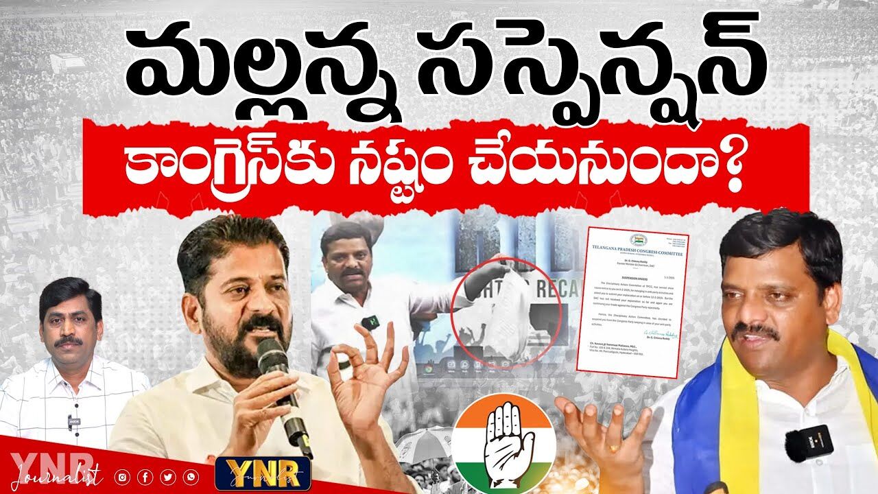 తెలంగాణలో కాంగ్రెస్ పార్టీ, ఆ పార్టీకే చెందిన ఎమ్మెల్సీ తీన్మార్ మల్లన్నను సస్పెండ్ చేసింది. రాష్ట్రంలో ప్రతిష్టాత్మకంగా చేపట్టిన బీసీ కులగణనను ఆయన వ్యతిరేకించడమే ప్రధాన కారణం. కొంత మంది పెద్దలు, ప్రభుత్వంలో ఉన్న అగ్రకులాల వారు బీసీల గణనను తప్పుదారి పట్టించారని తీన్మార్ మల్లన్న ఆరోపించారు. ముఖ్యంగా జానారెడ్డి లక్ష్యంగా ఆయన విమర్శలు చేశారు. బీసీ కులగణనను తప్పుల తడకగా చేశారని ఆ నివేదిక పత్రాలను తగలబెట్టాలని పిలుపునిచ్చారు. ఆ పేపర్లను చించివేశాడు తీన్మార్ మల్లన్న. రాహుల్గాంధీ దేశవ్యాప్తంగా బీసీల కులగణన చేయాలని డిమాండ్ చేస్తున్నారు. బీసీల జనాభా ఆధారంగా వారికి రిజర్వేషన్లు, ఫలాలు అందించాలనేది రాహుల్గాంధీ వాదన. రాహుల్గాంధీ చెప్పినట్లు తెలంగాణ ప్రభుత్వం ప్రతిష్టాత్మకంగా తీసుకొని బీసీ కులగణన చేపట్టింది. రాహుల్ డిమాండ్లో భాగంగానే రాష్ట్రంలో సర్వే చేపట్టింది. ఈ నేపథ్యంలోనే ఆ పార్టీ ఎమ్మెల్సీ బీసీ కులగణన పత్రాలను చించివేశాడు. ఈ నేపథ్యంలో తీన్మార్ మల్లన్నకు క్రమశిక్షణ కమిటీ నోటీసు ఇచ్చి వివరణ ఇవ్వాలని కోరింది. క్రమశిక్షణ కమిటీ ఇచ్చిన నోటీసును తీన్మార్ మల్లన్న లెక్క చేయలేదు. తీన్మార్ మల్లన్న నోటీసులకు సమాధానం ఇవ్వలేదని ఆయనను సస్పెండ్ చేస్తూ కాంగ్రెస్ పార్టీ ఈరోజు నిర్ణయం తీసుకుంది. ఈ అంశం కాంగ్రెస్కు నష్టం చేస్తుందా లేదా లాభం చేకూరుతుందా.. ఈ అంశంపై సీనియర్ జర్నలిస్ట్ 'YNR' విశ్లేషణ..!