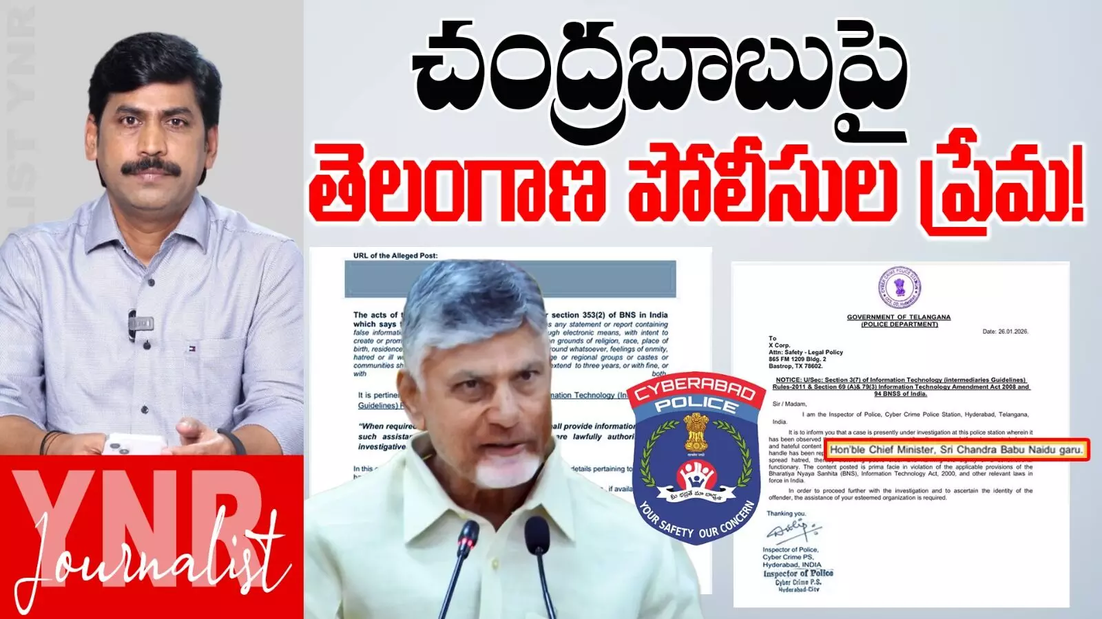 ఆంధ్రప్రదేశ్ ముఖ్యమంత్రి చంద్రబాబు నాయుడుపై తెలంగాణ నుంచి కొంతమంది ట్విట్టర్ హ్యాండిల్లో విద్వేషపూరిత వ్యాఖ్యలు చేస్తున్నారు. విద్వేష పూరితంగా ఆయన పైన పోస్టులు పెడుతున్నారు అంటూ పోలీసు శాఖ ట్విట్టర్కు ఓ లేఖ రాసింది. యుఎస్లో ఉండే ట్విట్టర్ హెడ్ క్వార్టర్ కి ఒక లేఖ రాసింది. వాళ్ళకి సంబంధించిన అకౌంట్ డీటెయిల్స్ అన్నీ మాకు ఇవ్వండి, వాళ్ళకి సంబంధించిన సమాచారాన్ని మాకు ఇవ్వండి, అంటూ తెలంగాణ సైబర్ క్రైమ్ పోలీసులు ట్విట్టర్కు ఒక లేఖ రాశారు. ఆశ్చర్యం ఏంటంటే ఆంధ్రప్రదేశ్ ముఖ్యమంత్రి పైన ఎవరో పోస్టులు పెడితే, ఆ పోస్టుల పైన ఎవరి కంప్లైంట్ లేకుండానే, తెలంగాణ సైబర్ పోలీసులు ఆ అకౌంట్లకు సంబంధించిన డీటెయిల్స్ మాకు ఇవ్వండి అని, లేఖ రాయటం ఆశ్చర్యం కలిగిస్తోంది. తెలంగాణ సైబర్ పోలీసులకు ఆంధ్రప్రదేశ్ ముఖ్యమంత్రి చంద్రబాబు నాయుడుపైన అంత ప్రేమ ఏంటో అర్థం కాలేదు, చంద్రబాబు నాయుడు పైన తెలంగాణకు సంబంధించిన వ్యక్తులు ట్విట్టర్లో చేసిన ఏ పోస్టు తెలంగాణ సమాజంలో అశాంతిని అన్రెస్ట్ ని క్రియేట్ చేసిందో, తెలంగాణ సైబర్ క్రైమ్ పోలీసులు చెప్పవలసి ఉంది. తెలంగాణ సైబర్ క్రైమ్ పోలీసులు ట్విట్టర్కి రాసిన లేఖలో చూస్తే ఒకసారి నేను రెండు లైన్లు చదివి వినిపిస్తా, ట్విట్టర్ నుంచి ఒక అకౌంట్ హోల్డర్ కి వచ్చిన లేఖ ఆ లేఖ పోలీసులు పంపించిన లేఖనే వాళ్ళు ఆ అకౌంట్ హోల్డర్ కి పంపించారు. తెలంగాణ పోలీసులు హనరబుల్ చీఫ్ మినిస్టర్ చంద్రబాబు నాయుడు గారి పైన హేటెడ్ కంటెంట్ ని హేటెడ్ పోస్టును, మీరు పెడుతున్నారు అని పెడుతున్న వాళ్ళ పైన చర్యలు తీసుకోవాలి, వాళ్ళకి సంబంధించిన సమాచారం ఇవ్వండి అని, ట్విట్టర్కు రాసింది, ఆయన ఆంధ్రప్రదేశ్ ముఖ్యమంత్రి అనే మాట కూడా తెలంగాణ పోలీసులు రాసే సాహసం చేయలేదు, ఇప్పుడు ఈ తెలంగాణ పోలీసులు హానరబుల్ సీఎం చంద్రబాబు నాయుడు పైన ఇటువంటి పోస్టులు పెడుతున్నారు అని లేఖ రాస్తే ట్విట్టర్ వాడు ఏమనుకోవాలి. తెలంగాణకు ముఖ్యమంత్రి చంద్రబాబు నాయుడు ఏమో అనుకోవాలి అంతే కదా, తెలంగాణ పోలీసులు లేఖ రాసిన ఆంధ్రప్రదేశ్ ముఖ్యమంత్రి చంద్రబాబు నాయుడుపైన ఇటువంటి పోస్టులు హైదరాబాద్ నుంచి పెడుతున్నారు కాబట్టి, దాని పైన మాకు కంప్లైంట్ వచ్చింది, కంప్లైంట్ వచ్చింది కాబట్టి, కంప్లైంట్ కి సంబంధించిన ఇన్వెస్టిగేషన్ చేయబోతున్నాం, ఇన్వెస్టిగేషన్ చేయాలంటే దానికి సంబంధించిన అకౌంట్ కి సంబంధించిన డీటెయిల్ కావాలి, డీటెయిల్ కావాలి కాబట్టి, ఆ డీటెయిల్స్ మాకు ఇవ్వండి అని అడగాలి, బట్ ఈ కంప్లైంట్ చేసిన వాళ్ళు ఎవరో తెలీదు, అసలు ఎవరు కంప్లైంట్ ఇచ్చారో లేదో తెలియదు, తెలంగాణ పోలీసులు ట్విట్టర్కు లేఖ రాశారు. తెలంగాణ పోలీసులు రాసిన లేఖలో హనరబుల్ చీఫ్ మినిస్టర్ 