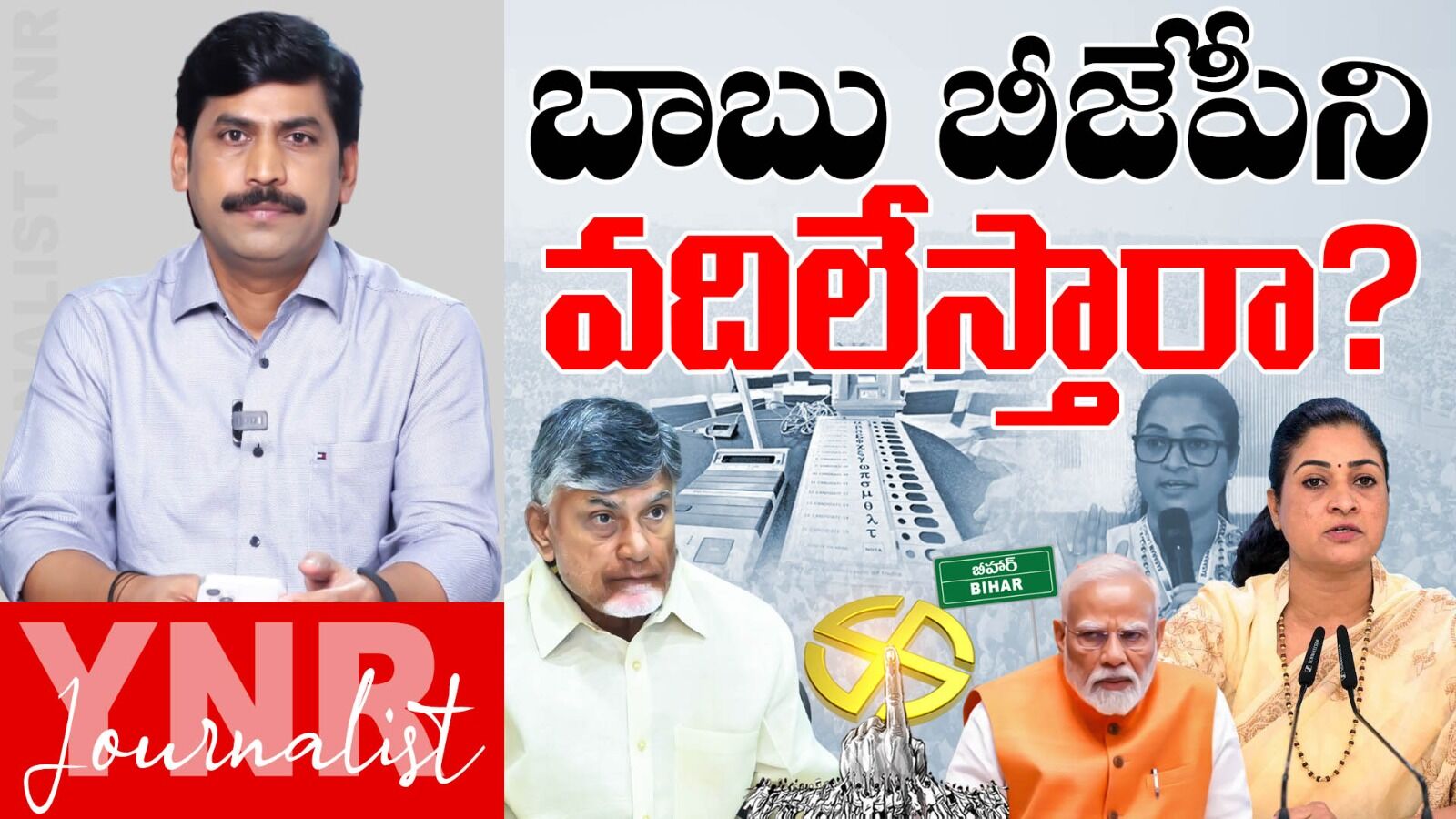 బీహార్లో బీజేపీని ఓడిస్తే, మీరు ఓటు వేయండి బీహార్లో బీజేపీ ఓడిపోయిందంటే ఎన్డిఏ నుంచి బయటికి రావడానికి టీడిపి రెడీగా ఉంది. బీహార్ నుంచి మీరు బీజేపీని బయటికి పంపించండి, ఎన్డిఏ నుంచి టీడీపీ బయటికి రావడానికి రెడీగా ఉంది, మీరు ఇక్కడ గనుక బిజేపీని ఓడిస్తే కేంద్రంలో బీజేపీ ప్రభుత్వం పడిపోతుంది, ఎందుకంటే ఆంధ్రప్రదేశ్ ముఖ్యమంత్రి బీజేపీకి మద్దతు ఉపసంహరించడానికి రెడీగా ఉన్నాడు, బీజేపీ బలంగా ఉందనో, మరో కారణాలతోటి ఆయన బీజేపీతో ఉంటున్నాడు తప్ప బీజేపీ పైన ఇష్టంతో కాదు, బీజేపీ బీహార్లో ఓడిపోయిందంటే చంద్రబాబు కేంద్రానికి మద్దతు ఉపసంహరిస్తారు అంటూ కాంగ్రెస్ పార్టీ క్యాంపెయిన్ చేస్తుంది. చంద్రబాబు మద్దతు ఉపసంహరిస్తారని, ఎవరికి చెప్పారు, కాంగ్రెస్ పార్టీకి చెప్పారా, కాంగ్రెస్ పార్టీకి తెలుసా, లేదా చంద్రబాబు మద్దతు ఉపసంహరిస్తారని, కాంగ్రెస్ బీహార్లో క్యాంపెయిన్ చేస్తున్న విషయం చంద్రబాబుకి తెలుసా, తెలిస్తే కూడా మౌనంగా ఉన్నారా ఇవి ఇప్పుడు చర్చనీయ అంశమైన విషయాలుగా ఉన్నాయి. ఈ అంశంపై సీనియర్ జర్నలిస్ట్ 'YNR' విశ్లేషణ..